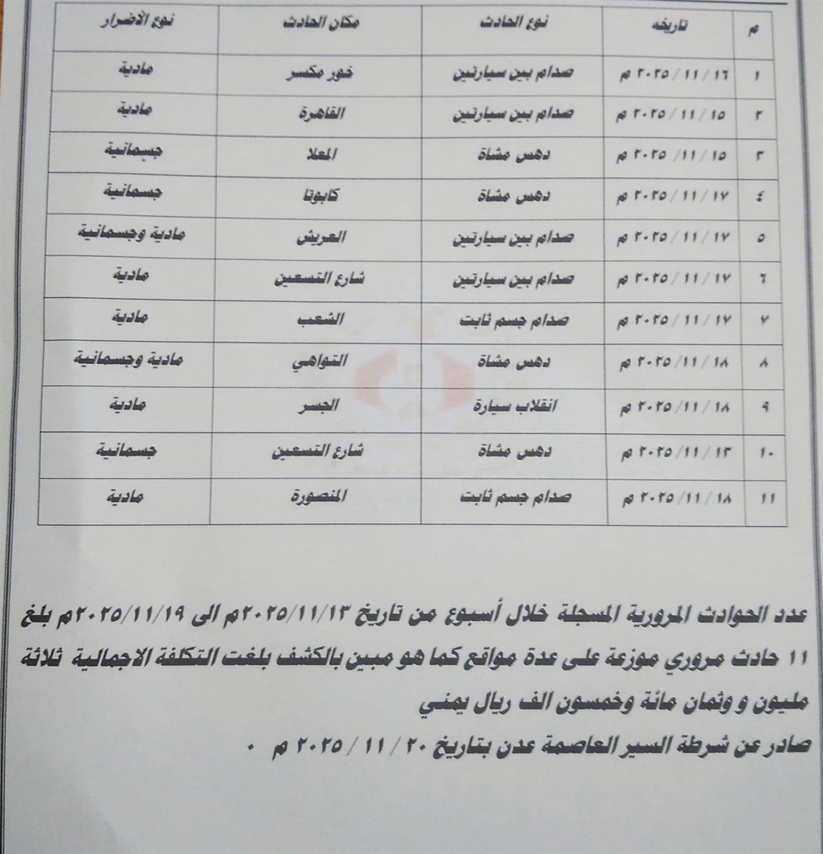 واصلت إدارة شرطة السير بالعاصمة عدن حملاتها لتعزيز الانضباط المروري ورصد المخالفات، حيث سجّلت خلال الفترة من 13 إلى 19 نوفمبر الجاري 2972 مخالفة مرورية.