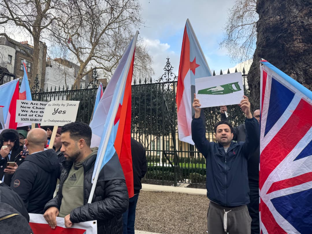 وقفة احتجاجية لأبناء الجنوب أمام السفارة السعودية في لندن تنديداً بقصف المدنيين وعسكرة المدن