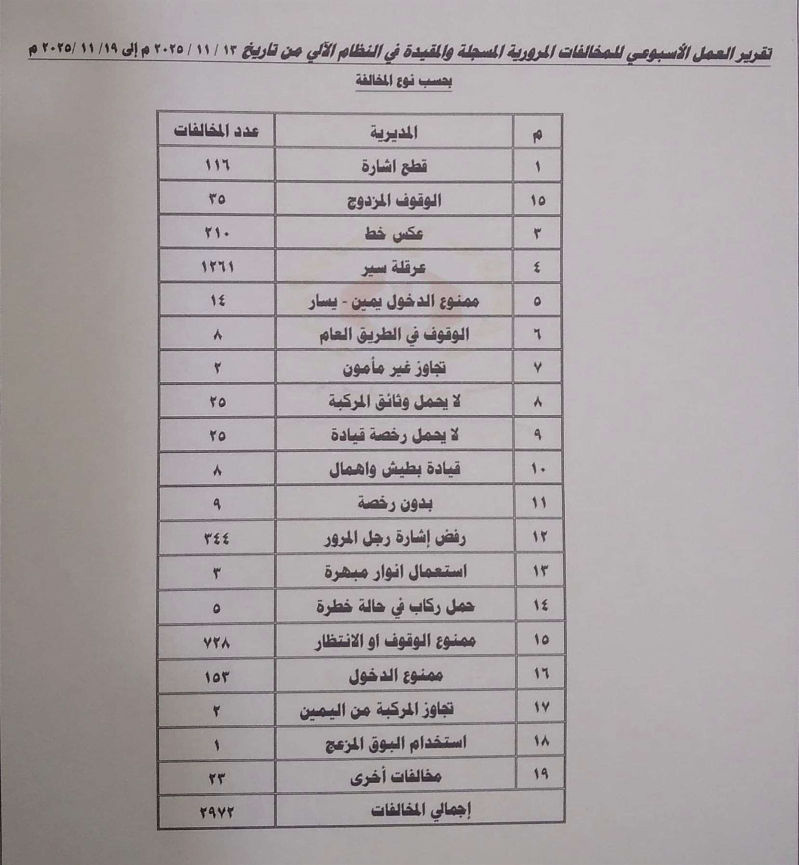 واصلت إدارة شرطة السير بالعاصمة عدن حملاتها لتعزيز الانضباط المروري ورصد المخالفات، حيث سجّلت خلال الفترة من 13 إلى 19 نوفمبر الجاري 2972 مخالفة مرورية.