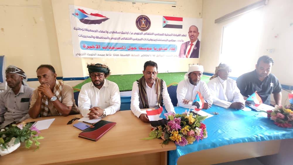 قيادة انتقالي سقطرى تعقد لقاءً تشاورياً موسعًا وتؤكد تمسكها بالمشروع الوطني الجنوبي ورفض المساس بالمجلس